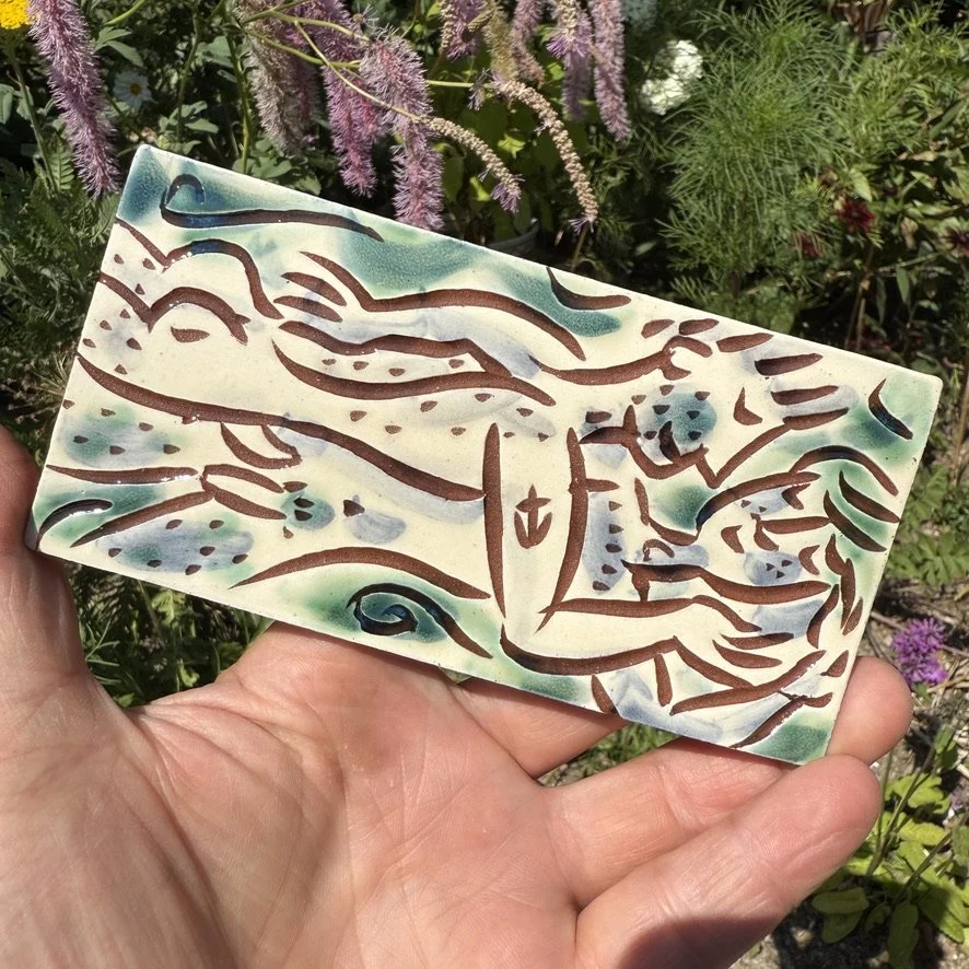 Earthenware tile with creamy white slip and a clear glaze, carved and decorated with coloured glaze in blue and green.